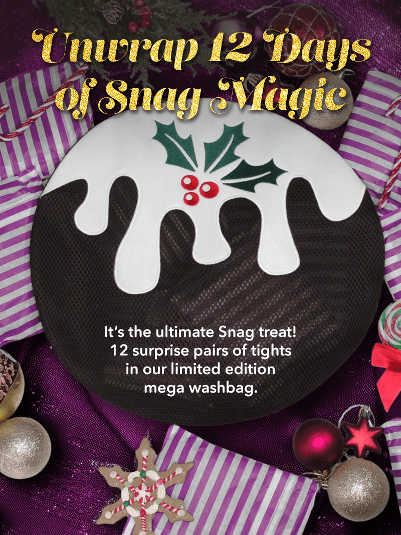 We’ve packed 12 individually wrapped mystery pairs of our super-comfy tights into a brand-new, mega-sized Christmas pudding washbag. The Snag Elves have hand-picked every pair from our previous collections, so what you get is a total surprise. Think fan-favourites, hidden gems, and must-have classics.