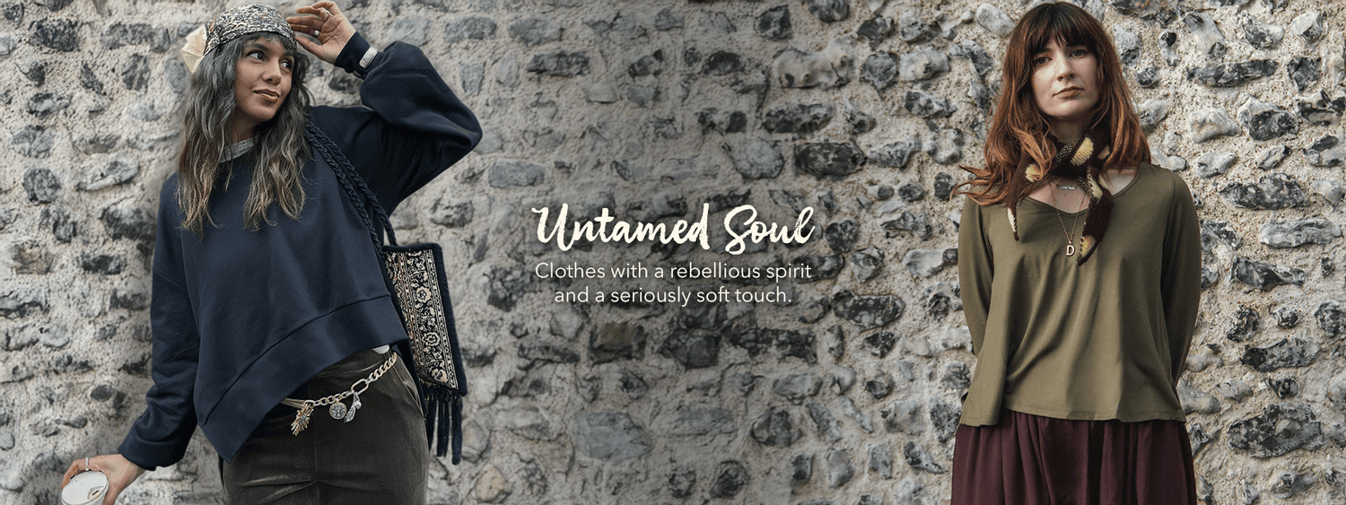 The Untamed Soul sustainable loungewear collection is your rebelliously soft style upgrade. The Bibi fleece dress delivers a classic fit-and-flare silhouette with cosy fleece lining—the ultimate winter dress with deep pockets. The Junko oversized crop jumper offers slouchy comfort with thumb holes. Prefer lighter layers? The Marsha long sleeve crop top and Claudette wide leg trousers bring boho vibes in cooling viscose.