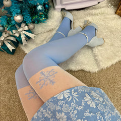 Meet Snowflake Garter, the magical 80 denier tights that give you the look of thigh-high stockings without any of the faff. Crafted in our pastel blue Denim shade with a delicate snowflake band circling the upper thigh like a festive garter, these tights create a stunning stocking illusion before shifting to a crisp white upper that runs right to the waistband. All the charm of thigh highs, none of the chilly bottom or the hassle of wrestling with suspender belts.