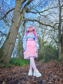 Snuggle up and meet our new Cloud Cardigan. In the same style as our sell out Rainbeaux style, our Cloud Cardi is the cosy, brand-new joy of our Stars & Clouds collection. It is a hip-length cardigan knitted in our exclusive Cloud print with a serene sky blue base scattered with fluffy white clouds and little stars.