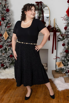 Entrez dans la saison des fêtes avec la jupe midi à volants Snag Lurex, d'un noir classique. Sublimée par son esprit festif, cette jupe allie mouvement, brillance et confort. Sa taille élastiquée de 6 cm (doublée de coton doux, car personne n'aime les ceintures qui grattent) maintient parfaitement en place pendant que vous dansez jusqu'au bout de la nuit.