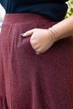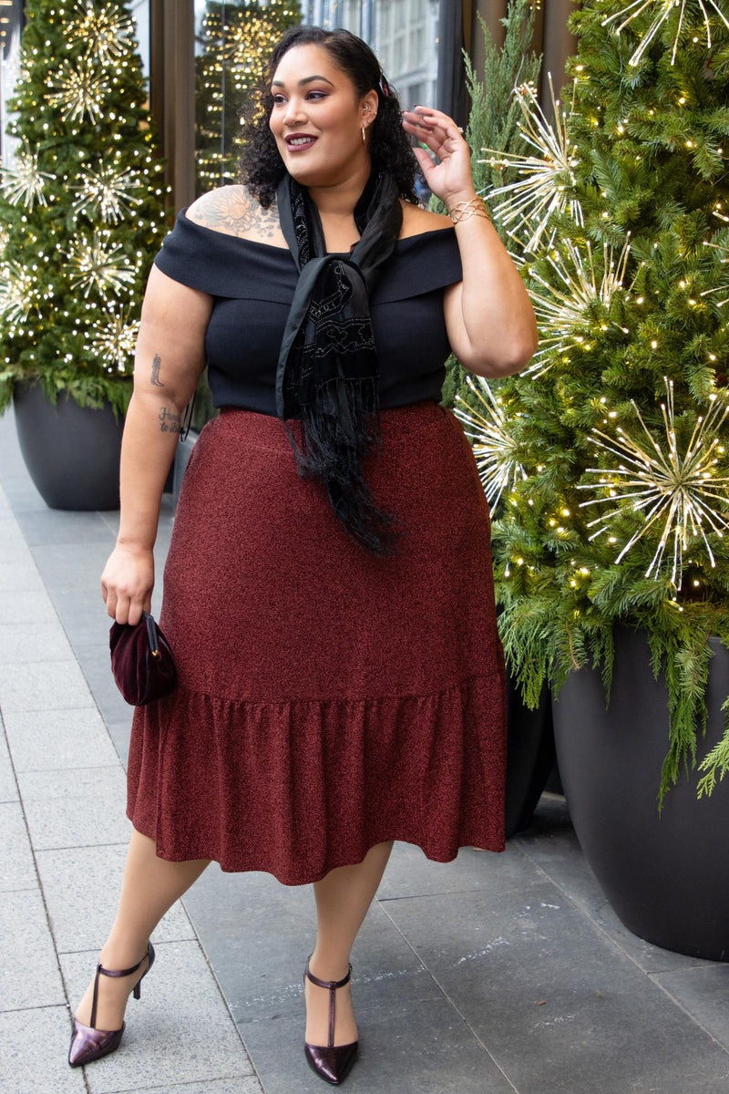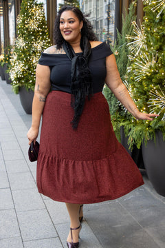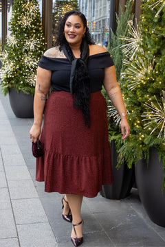 Entrez dans la saison des fêtes avec la jupe midi à volants Snag Lurex d'un rouge bordeaux intense. Scintillante et festive, cette jupe est synonyme de mouvement, d'éclat et de confort. Sa taille élastiquée de 6 cm (doublée de coton doux, car personne n'aime les ceintures qui grattent) maintient parfaitement le vêtement en place pendant que vous dansez jusqu'au bout de la nuit.