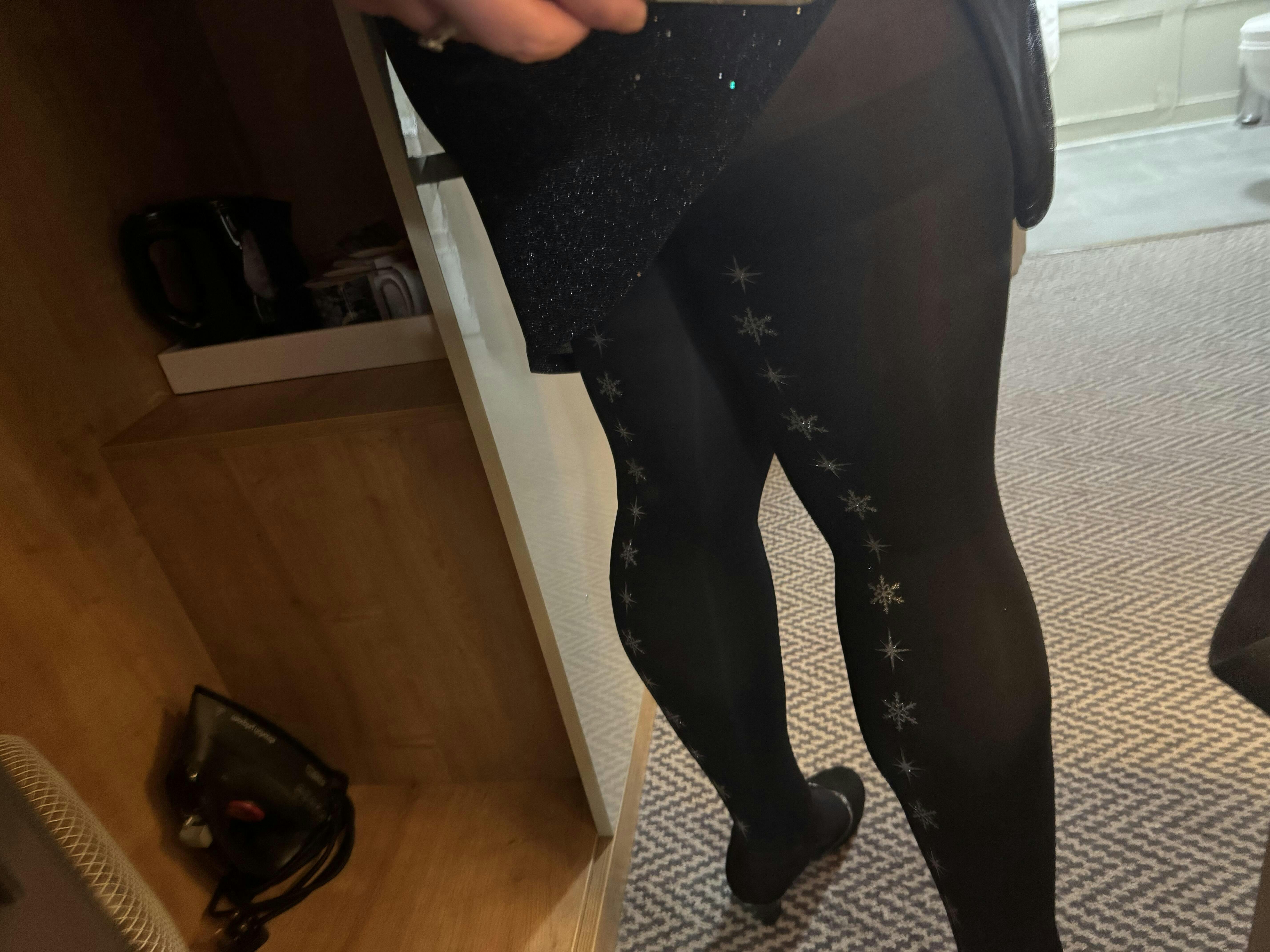 - 80 denier black base with glitter stars and snowflakes creating a festive back seam