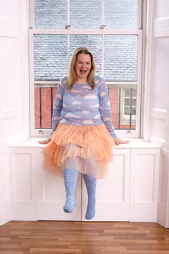 Float up and meet the Cloud Mesh Top. It is a semi-sheer top boasting our exclusive Cloud print with a gentle sky blue base scattered with billowy white clouds and a smattering of little stars.
