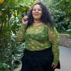 If cute frogs are your power animal, this one's for you. The Hoppy Meadow Mesh Top is set on a soft mesh base with playful green frogs dotted all over, from strawberry hugging cuties to frogs in tiny toadstool hats. This long sleeved top is bold, fun and completely impossible not to smile at. Long-sleeved with thumbholes, round neckline and a sleek fitted shape, it’s a statement that still feels easy to wear.