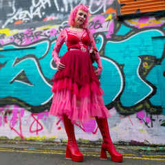 The Love Me Mesh Top wears its heart out loud. Set on a soft pink mesh base and scattered with bold red hearts, this long-sleeved top is playful, flirty and just a little bit daring. Classic round neckline, fitted silhouette, designed to turn everyday outfits into something far more fun.